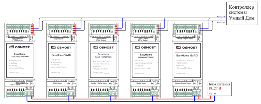 - Подключите модули к шине RS-485 для управления с контроллера.