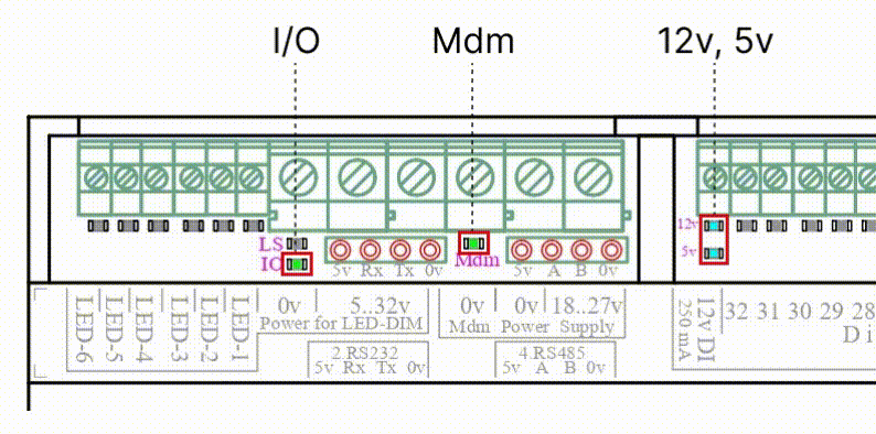 Индикатор обмена I/O - мигает с периодом 2 секунды (1+1) без связи с интерфейсом. Индикаторы 12v, 5v и Mdm (показывает возможность подключения модема) горят постоянно.