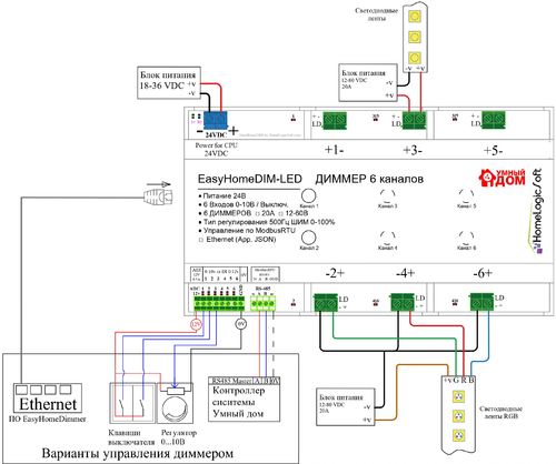 Диммеры поддерживают управление с приложения, от кнопок и регуляторов и по протоколу ModbusRtu через порт RS-485. Ниже представлена схема подключения.