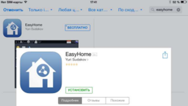 [[Файл:Установка 2.3.1.png|центр|мини|386x386пкс|Рисунок 2.3.1. ПО EasyHome в App Store]] | |||