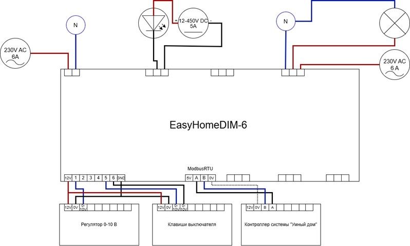 Перед началом работы с диммером необходимо выполнить его подключение к источнику питания, а также подключение коммутируемых устройств и интерфейсов управления. | Перед началом работы с диммером необходимо выполнить его подключение к источнику питания, а также подключение коммутируемых устройств и интерфейсов управления. | ||