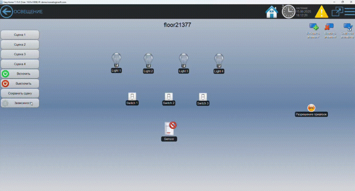 - В каждом помещении есть предустановленные две минисцены освещения "Включить весь свет" и "Выключить весь свет".
