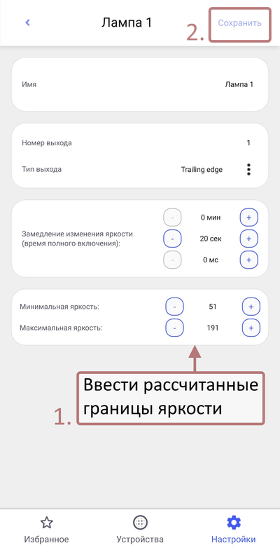 Для корректного управления подключенными к диммеру устройствами, необходимо установить пороговые значений минимальной и максимальной яркости свечения.