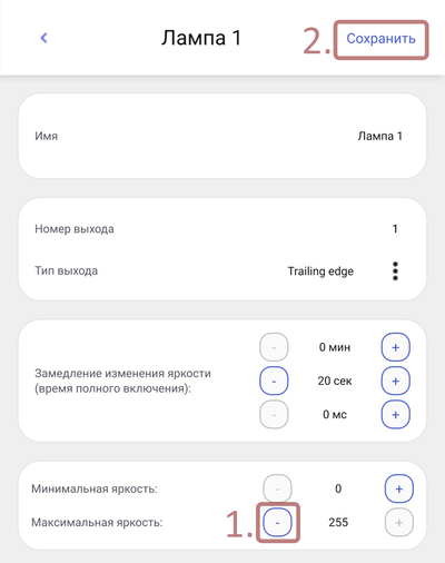 5. Уменьшите максимальную яркости лампы, нажимая кнопку «-». Нажмите сохранить.