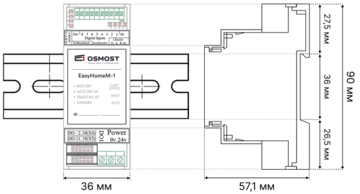Контроллер устанавливается на DIN-рейку, занимает 2 DIN места.