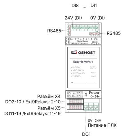 - два порта RS485 с питанием 5в для подключения расширений и внешних устройств (датчики температуры, модули ввода-вывода ОВЕН, диммерами EasyHomeDIM и РазумДом, Кондиционеры, Вентустановки, прочее).
