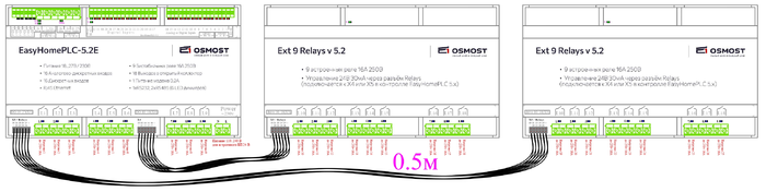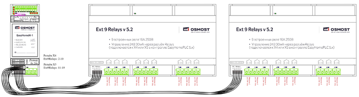 В комплекте с EasyHome Ext 9 Relays идет провод длиной 50 см для подключения к контроллерам. К одному контроллеру можно подключить до двух блоков реле, которые расширяют его дискретные выходы (DO 10..27 для контроллера EasyHomePLC-5.2E, DO 2..19 для контроллера EasyHomeM-1).