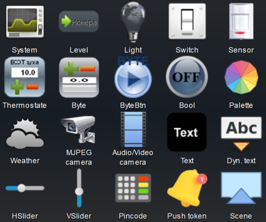 Предусмотрен так же ряд вспомогательных системных разделов Secure, Settings, Alerts, Connection, Info, Exit, Scenes, настройки которых хранятся в файле системных функций config.xml, подробное описание см. раздел XML.