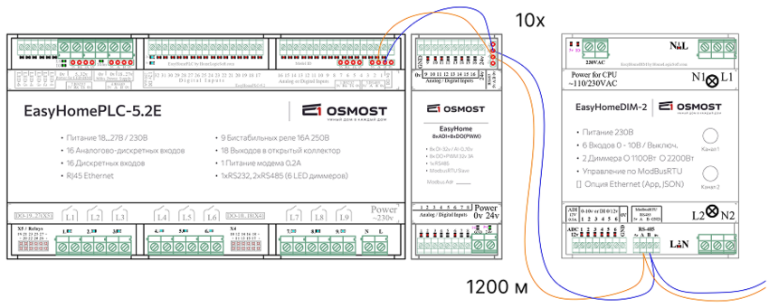 Для расширения функционала контроллера вы можете подключить до 10ти модулей расширения EasyHomeMODUL, ОВЕН Mx-110, диммеров EasyHomeDIM, RazumDom по RS485: