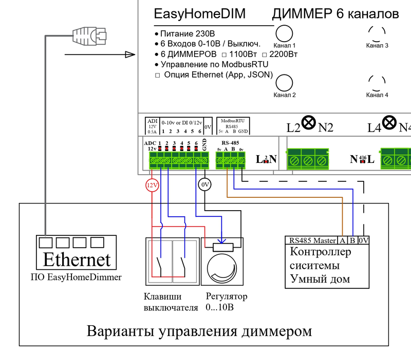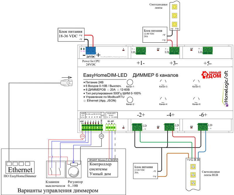 Диммеры поддерживают управление с приложения, от кнопок и регуляторов и по протоколу ModbusRtu через порт RS-485. Ниже представлена схема подключения.