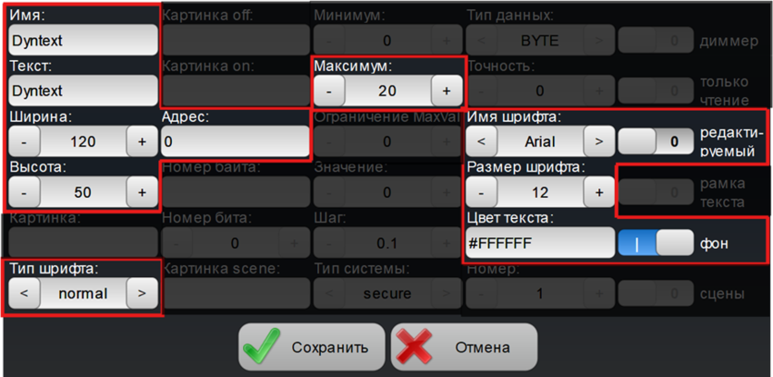 Данный элемент считывает с ModbusTCP 8 байт с указанного адреса и отображает 8 символов ASCII в поле текста. Также есть возможность записи текста в память ModbusTCP сервера. Все символы после завершения строки записываются нулями в указанную область. Символы записываются в виде байт значений в ASCII коде. Запись происходит при нажатии кнопки “Запись” (Свойство – редактируемый вкл.).